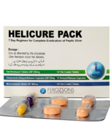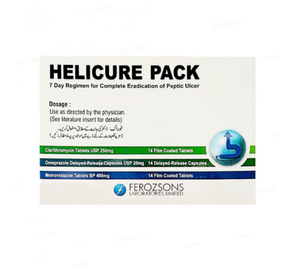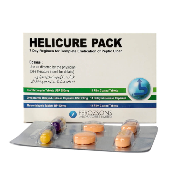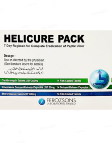 Helicure Tablets are a combination therapy comprising of anti-bacterial, anti-ulcerate, and anti-amoebic agents. It is widely used in a complete treatment course for the eradication of Helicobacter pylori. Helicure Therapy is also used to treat acute bacterial exacerbation of chronic bronchitis, sinusitis, pharyngitis, tonsillitis, and pneumonia.