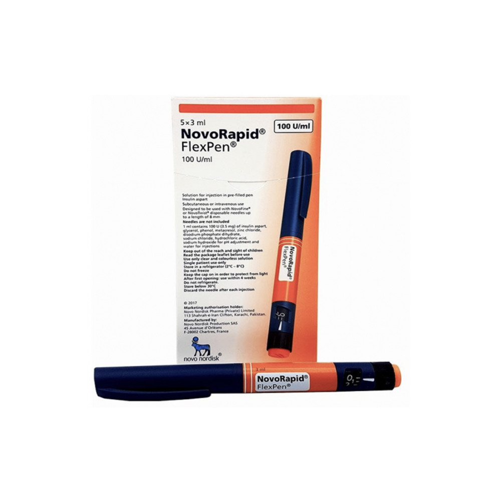 NovoRapid Flexpen Injection 100 IU 5 Pre filled Penx3 mL is a replacement insulin which works by enhancing the glucose uptake for energy production. This helps in controlling the blood glucose levels.